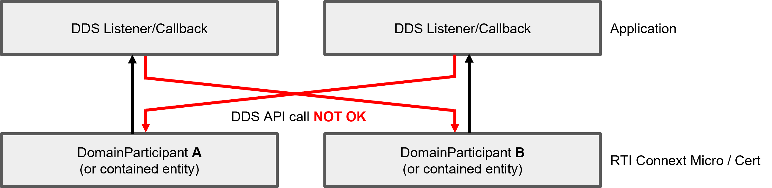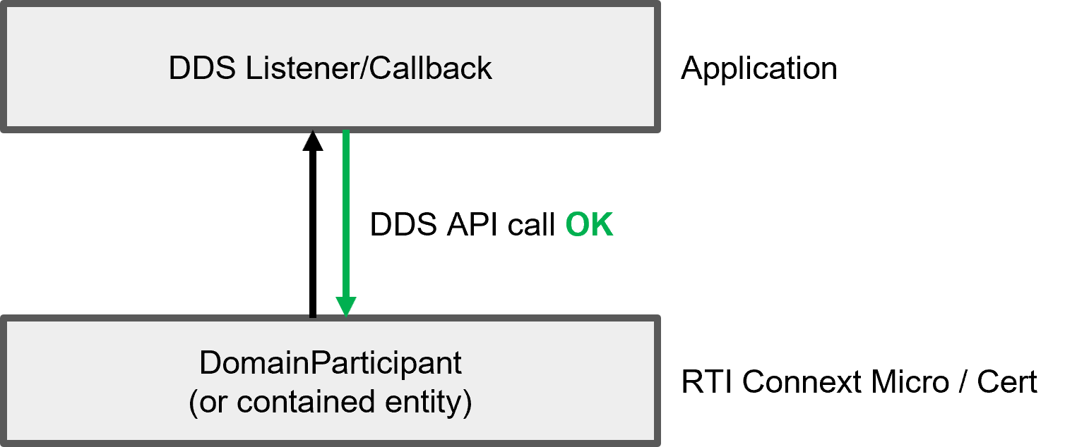 There are no deadlock scenarios when a listener calls Connext Cert DDS APIs from the same DomainParticipant (and contained entities) that the listener was called from, as shown in the diagram below: