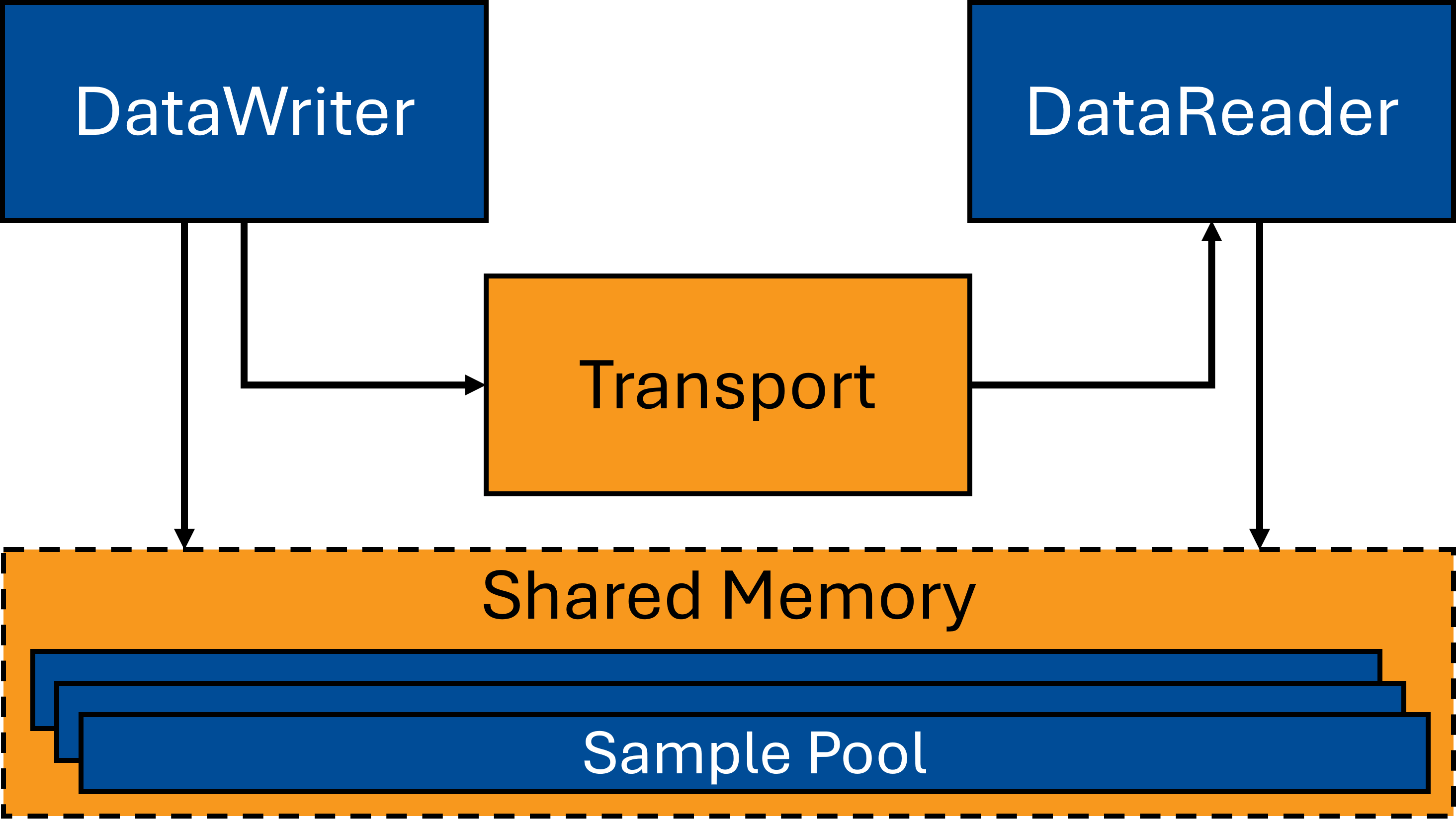 At a high level, Zero Copy transfer works by a DataWriter and DataReader accessing the same shared memory; see Figure 7.4 below. A Zero Copy-enabled DataWriter creates a structure in a shared memory region and allocates samples from its pool to shared memory. When samples are published by the DataWriter, matching DataReaders are notified via a transport that new samples are available in shared memory. The DataReader then accesses the samples in shared memory using the standard DDS read/take APIs. Note that the DataReader and DataWriter must be co-located—that is, within the same operating system instance.