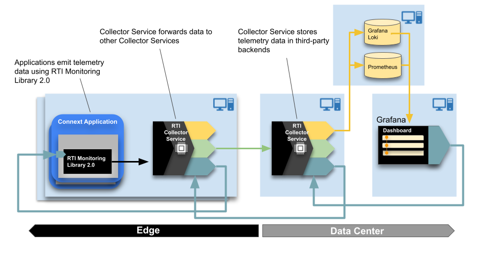 • RTI Observability Collector Service scalably collects telemetry data forwarded by Monitoring Library 2.0 in individual Connext applications and sends it for storage to third-party telemetry backends. The service provides native integration with Prometheus as the time-series database to store Connext metrics and with Grafana Loki as the log aggregation system to store Connext logs and security events. The service can also send data to an OTel Collector for integration with other third-party observability backends.