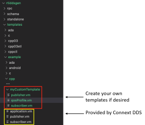 Generates a custom example application using the specified custom publisher and subscriber templates, instead of the default example files. Place your custom templates in $NDDSHOME/resource/app/app_support/rtiddsgen/templates/example/<language>/<exampleTemplateDirectoryName>/. Name them publisher.vm and subscriber.vm; you can also add a QoS template (qosProfile.vm) file to your example template directory (if you don't, Code Generator will use the default one, $NDDSHOME/resource/app/app_support/rtiddsgen/templates/example/qosProfile.vm). You can base your templates on those that Connext provides in $NDDSHOME/resource/app/app_support/rtiddsgen/templates/example/<language>.