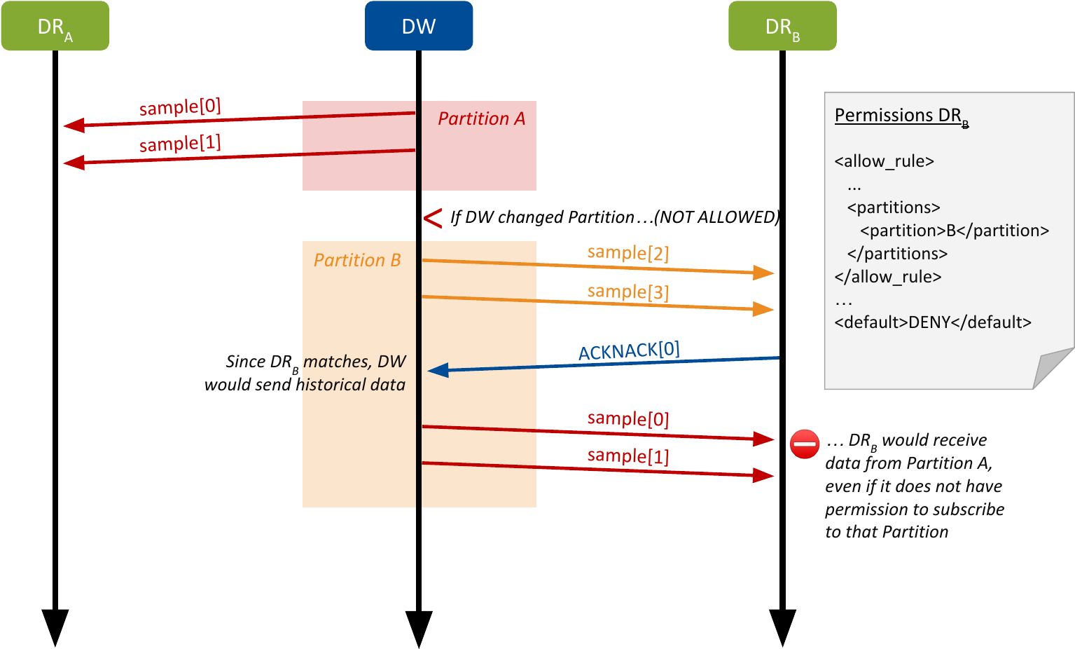 When these two criteria are met, a DataWriter should send historical data only to DataReaders that were passing the topic access control rules at the time the historical data was generated. The rule about PartitionQoS immutability enforces this behavior by conservatively preventing a DataWriter of a protected Topic from sending historical data to DataReaders that were not matched before a PartitionQoS change and that potentially could have failed to pass the topic access control rules.