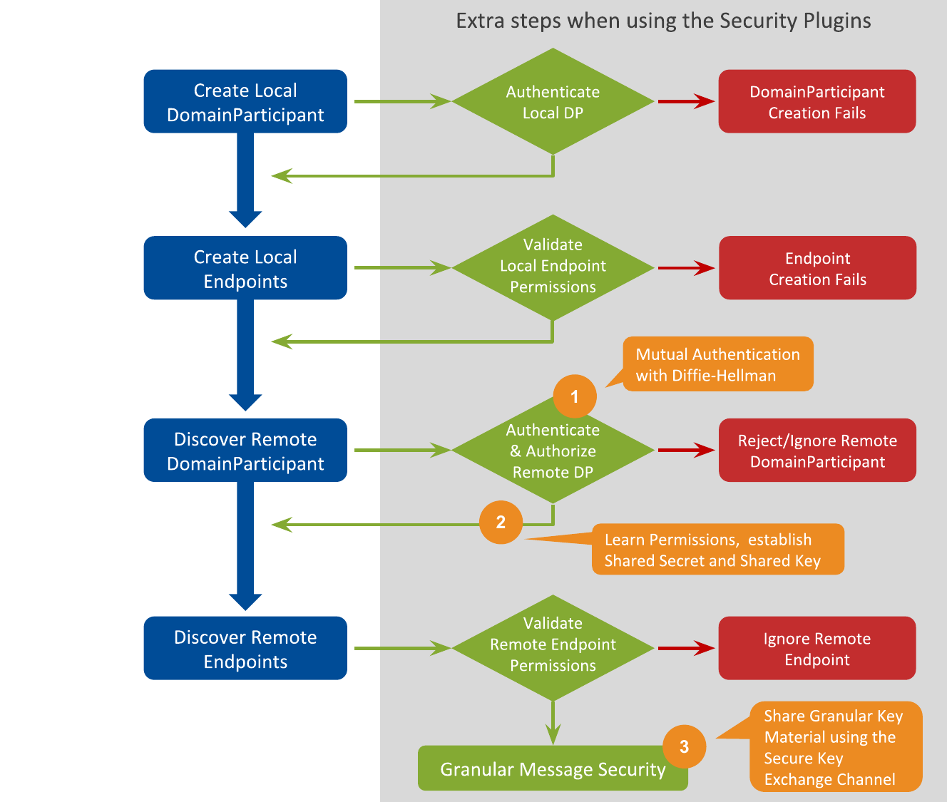 When you enable the Security Plugins, your DDS applications will require some extra steps to create the DomainParticipants and perform the DDS Discovery process, as depicted in Figure 11.1. These steps make sure that the security rules defined in your Governance Document apply, that DomainParticipants are mutually authenticated, and that they only have access to the data they are allowed to access (as defined in the Permissions Documents), to cite a few examples.