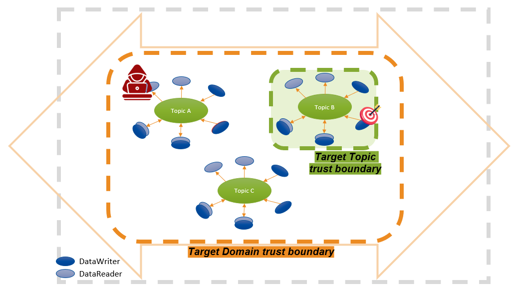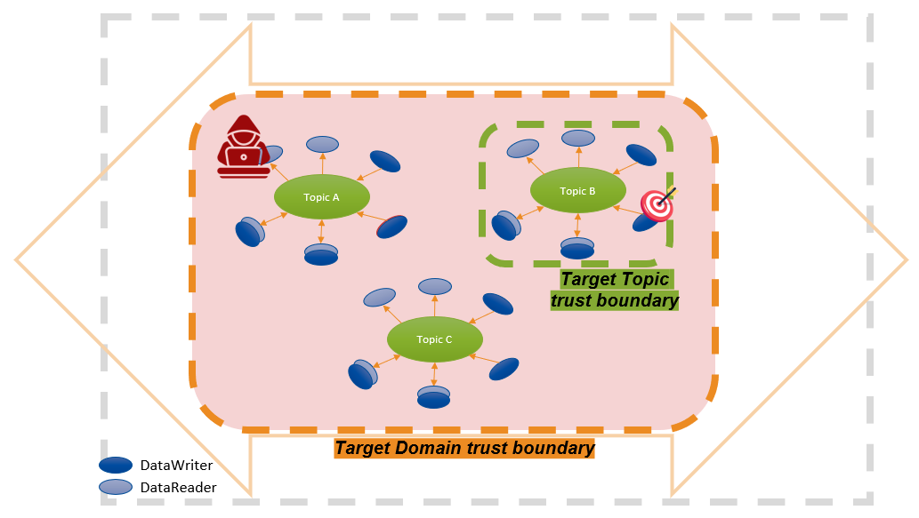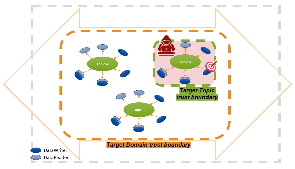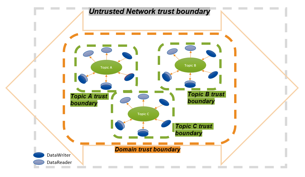 Topic Trust Boundary: A logical boundary between what is inside a Topic (data, applications running authorized DataWriters and/or DataReaders) and what is outside the Topic.