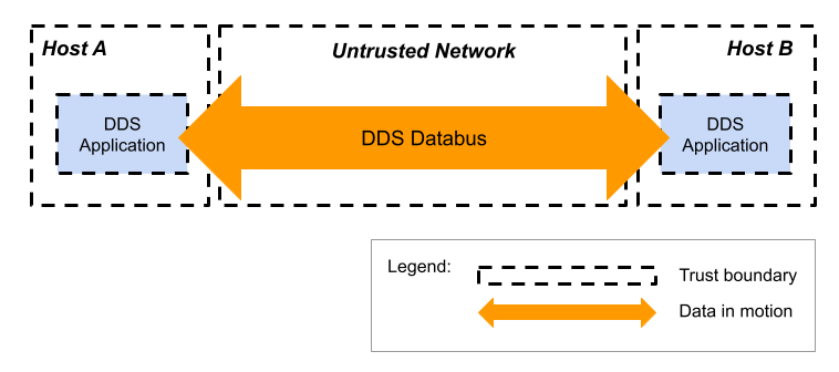 The DDS Security threat model is depicted in the following figure, where the area of interest is the untrusted network: