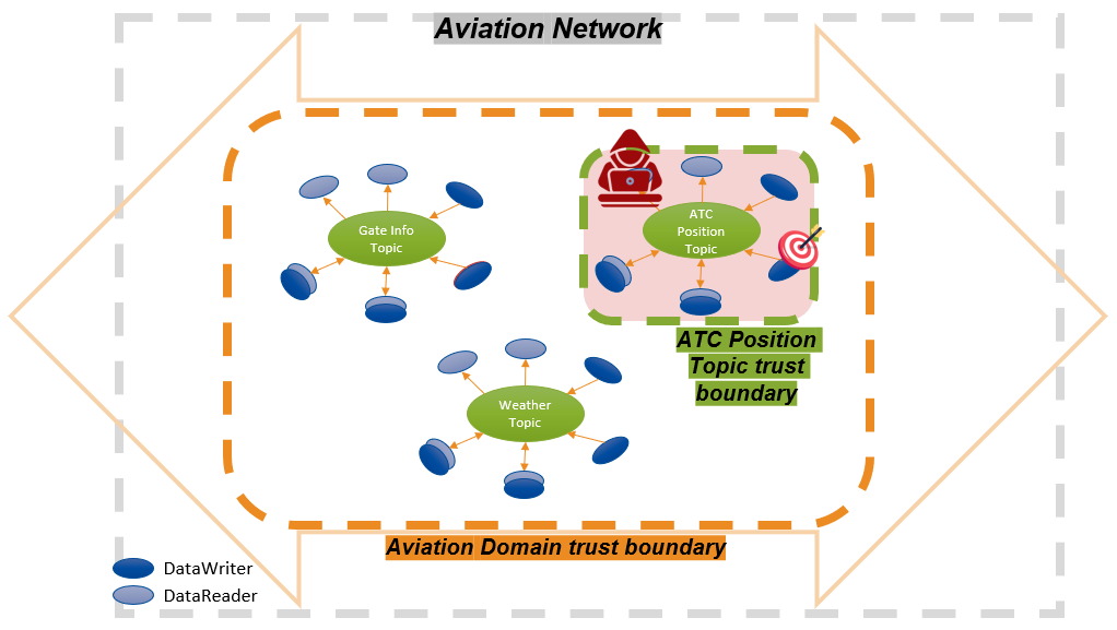 Aviation example where we need to protect the aviation services Domain from unauthorized Domain Outsider STDE attacks. Also, we need to protect the ATC positioning topic from unauthorized writes or reads from planes that publish into that Topic (i.e., STIDE Topic Insider Protection).