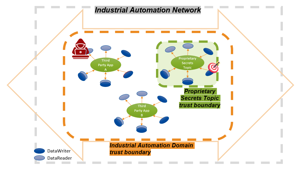 Topic Outsider Protection: A form of Granular Protection Inside Domains, mitigate attacks initiated by actors not authorized to publish and/or subscribe to/from a given Topic. For example, a malicious actor that has stolen the credentials for an Identity authorized to join a Domain, but not authorized to publish or subscribe to the attack target Topic.