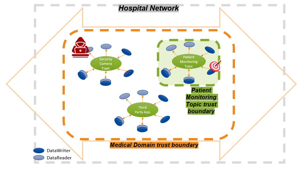 Medical example where we need to protect the medical system Domain from unauthorized Domain Outsiders STDE. Also, we need to protect the patient monitoring topic from being STDE from a potential hacked security camera within the hospital (which runs in the same Domain, but uses a different Topic).