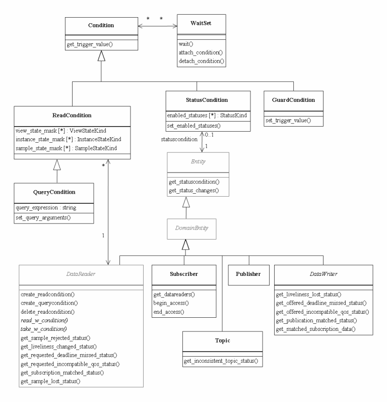 trigger_value of one or several DDS_Condition objects become DDS_BOOLEAN_TRUE. active_conditions, the list of DDS_Condition objects with trigger_value == DDS_BOOLEAN_TRUE) to actually get the information: by calling DDS_Entity_get_status_changes and then get_<communication_status>() on the relevant DDS_Entity, if the condition is a DDS_StatusCondition and the status changes, refer to plain communication status;