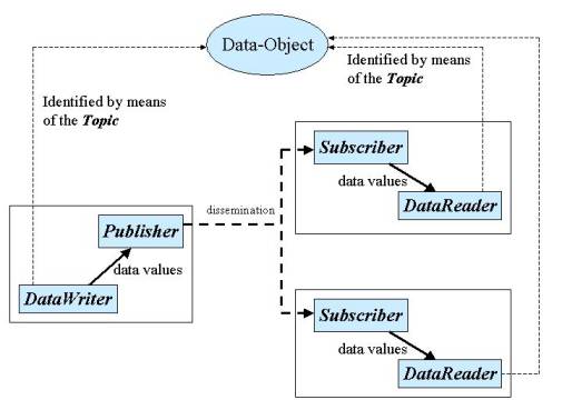 Information flows with the aid of the following constructs: DDS_Publisher and DDS_DataWriter on the sending side, DDS_Subscriber and DDS_DataReader on the receiving side.