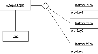 By definition, a com.rti.dds.topic.Topic corresponds to a single data type. However, several topics may refer to the same data type. Therefore, a com.rti.dds.topic.Topic identifies data of a single type, ranging from one single instance to a whole collection of instances of that given type. This is shown below for the hypothetical data type Foo.