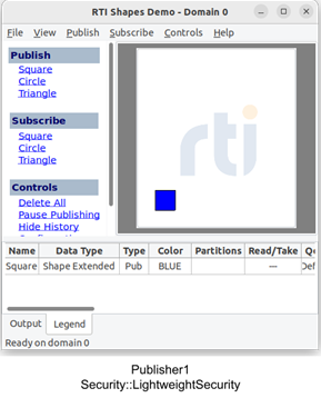 The blue square published by Publisher1 does not appear in Suscriber2. That's because Publisher1 is configured to use Pre-Shared Key Protection, but Susbscriber2 is not.