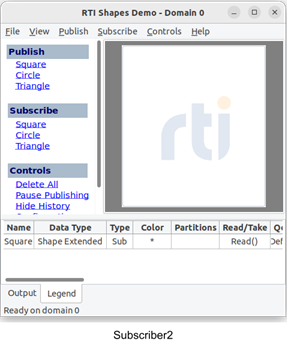 - Start a third instance of Shapes Demo; do not apply a QoS profile. We'll call this instance Subscriber2.