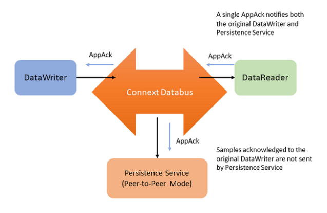 Application Acknowledgment is fully supported by RTI Persistence Service. The combination of Application Acknowledgment and Persistence Service is actually a common configuration. In addition to keeping DDS samples available until fully acknowledged, Persistence Service, when used in peer-to-peer mode, can take advantage of AppAck messages to avoid sending duplicate messages to the subscribing application. Because AppAck messages are sent to all matching writers, when the subscriber acknowledges the original publisher, Persistence Service will also be notified of this event and will not send out duplicate messages. This is illustrated in Figure 34.6: Application Acknowledgment and Persistence Service .