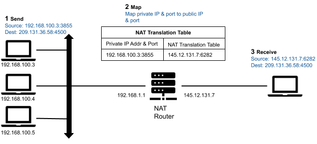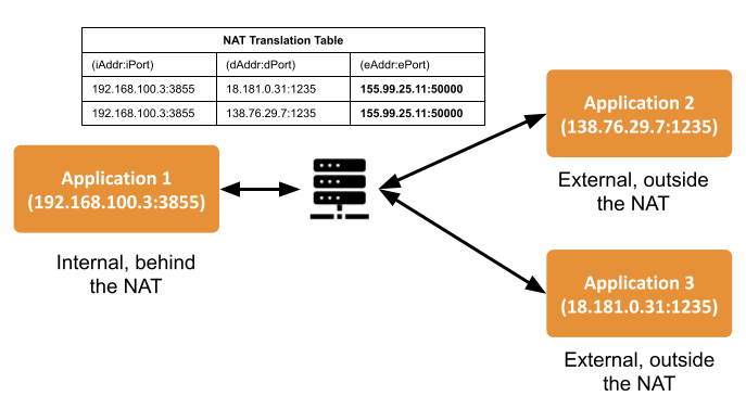 In WAN environments, applications running behind a NAT-enabled router typically need to communicate with applications running behind a different NAT-enabled router. NAT (Network Address Translation) is a method of remapping one private IP address and port into a public IP address and port by modifying the IP address and port information in the IP header of the packets while they are in transit across a NAT-enabled router. The technique has become a popular and essential tool in conserving the IPv4 global address space in the face of IPv4 address exhaustion. Many applications with individual private IP addresses can utilize a NAT-enabled router to communicate with external applications using a single public IP address.