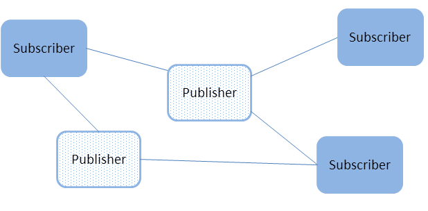Publish-subscribe model: In the publish-subscribe communications model (Figure 4.3: Publish-Subscribe), computer applications (nodes) “subscribe” to data they need and “publish” data they want to share. Messages pass directly between the publisher and the subscribers, rather than moving into and out of a centralized server. Most time-sensitive information intended to reach many people is sent by a publish-subscribe system. Examples of publish-subscribe systems in everyday life include television, magazines, and newspapers.