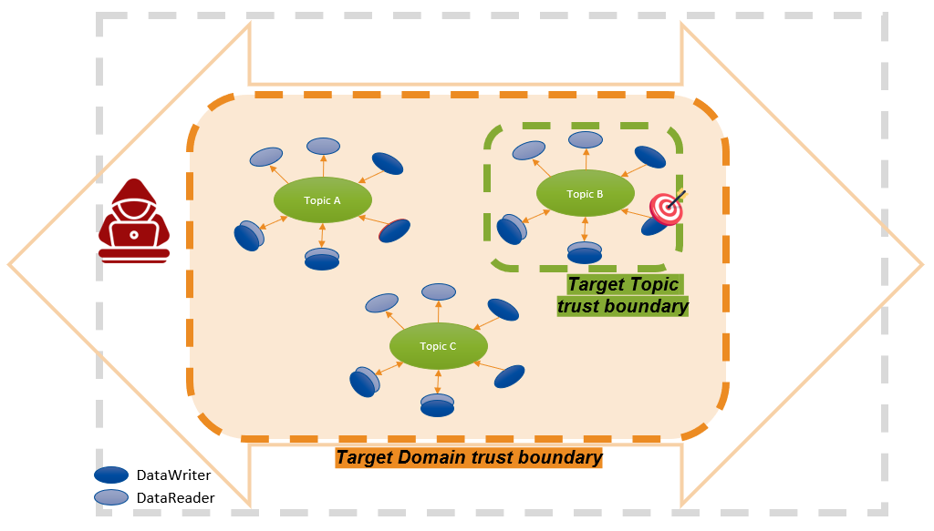Topic Trust Boundary: A logical boundary between what is inside a Topic (data, applications running authorized DataWriters and/or DataReaders) and what is outside the Topic.